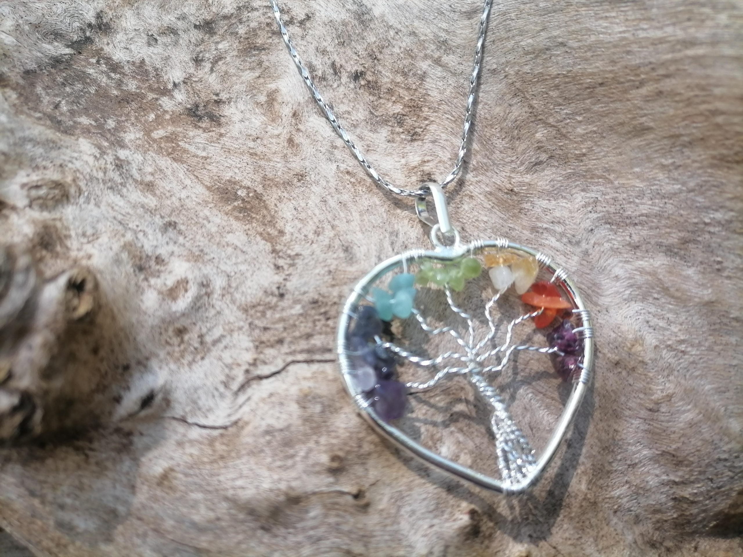 Colgante árbol de la vida con piedras preciosas 7 Chakras. Corazón Plateado 4cm. Cadena coreana acero inoxidable 50cm.