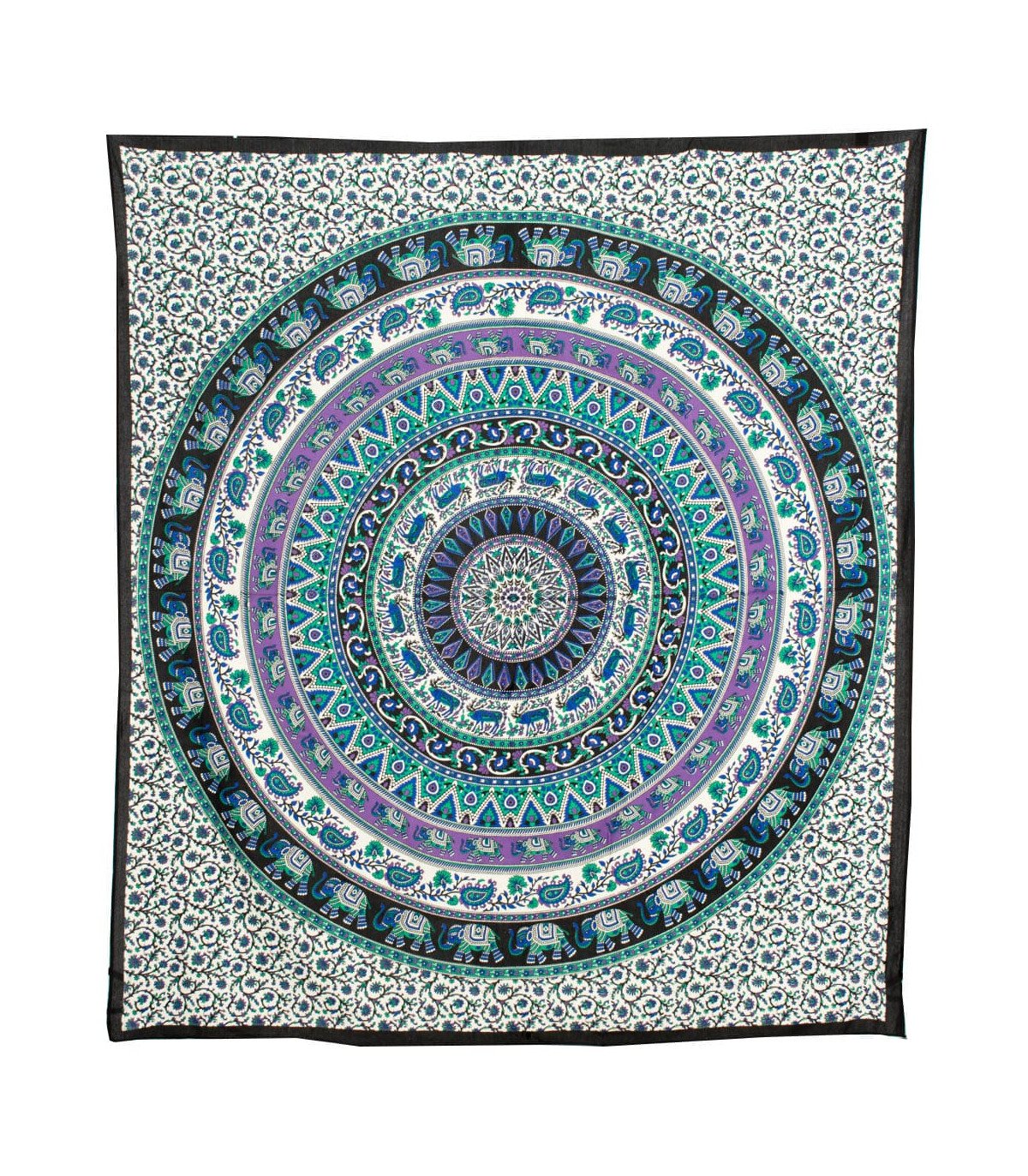 Cubrecama para cama doble con el dibujo de un mandala en el cual aparece repetidas veces la figura de un elefante.