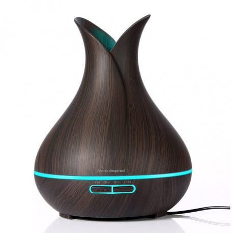 Proveedor de humidificador color claro con forma de tulipán, imitación madera palo de rosa. Tiempo de vaporizado 1h, 3h o 6h, con luces led multicolor. Incluye cable para red eléctrica y filtro.
