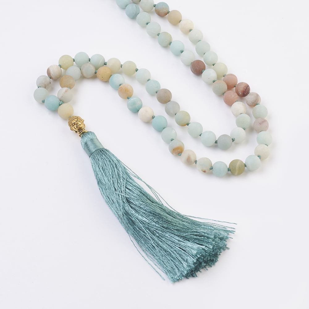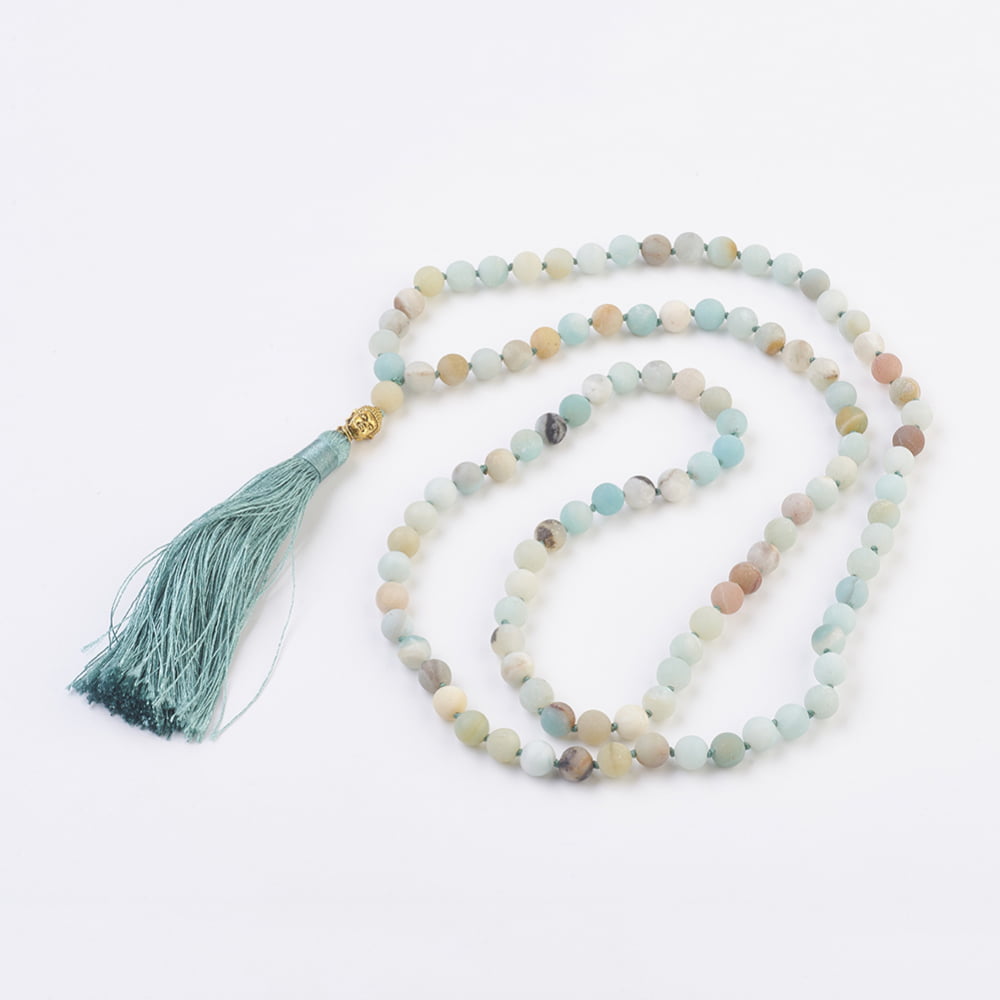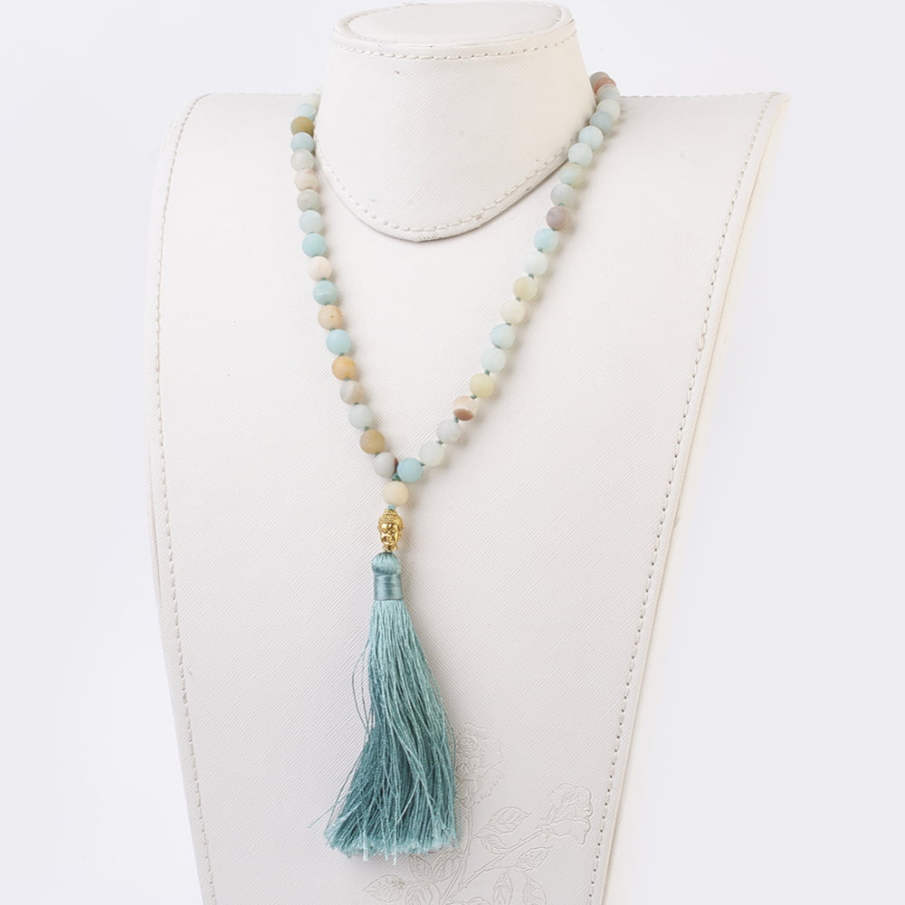 Un joya espectacular. 109 cuentas de piedras preciosas naturales de Amazonita. Con fornitura de aleación y borla de nylon.