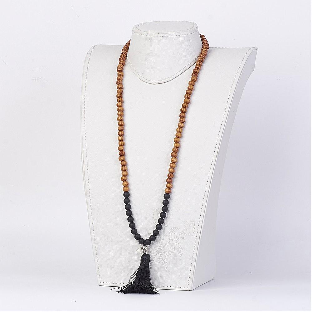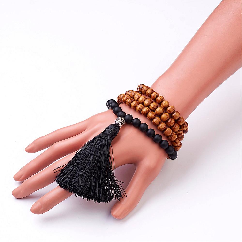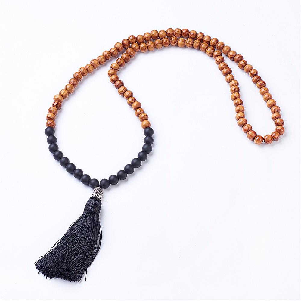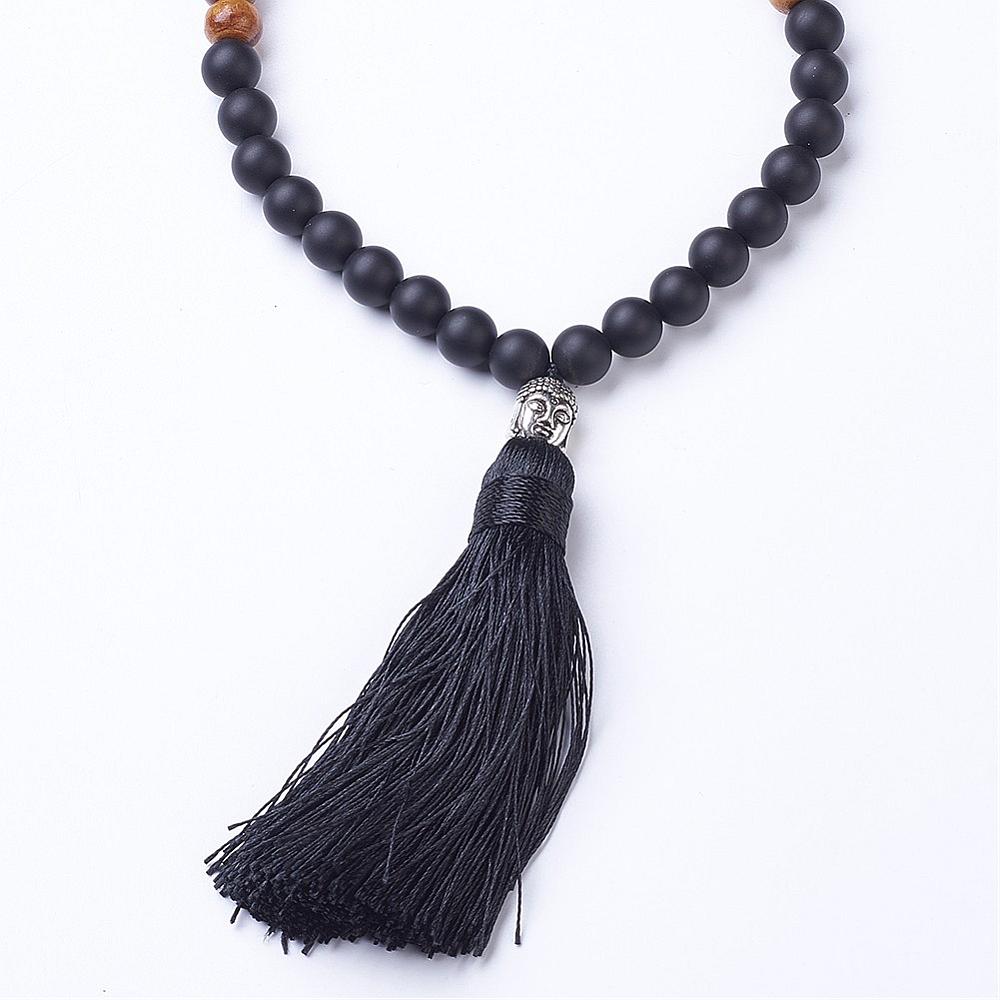 Piedra Preciosa natural y cuentas de madera. Abalorio de aleación de buda y borla colgante negra.