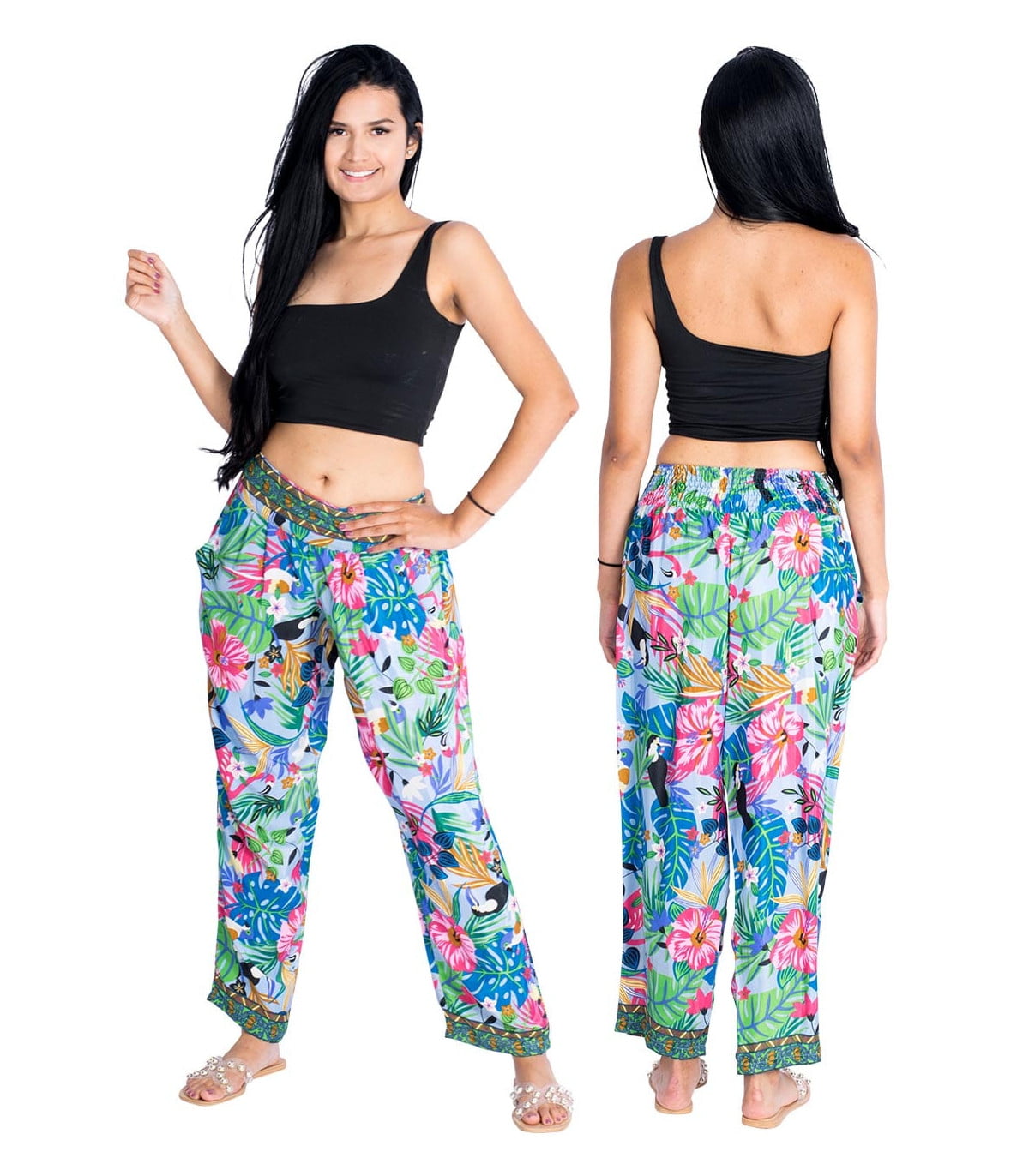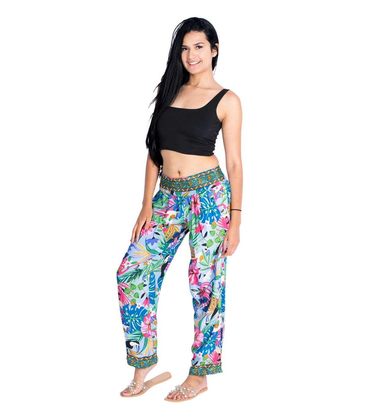 Pantalon de seda con goma en la cintura en su parte posterior. Estampado muy colorido.