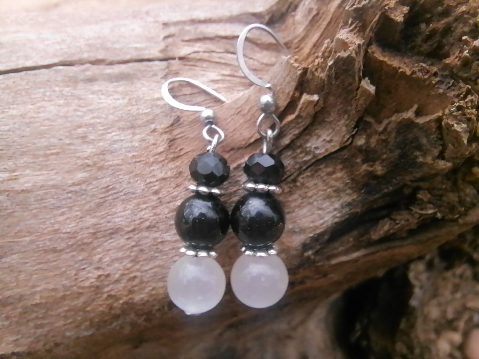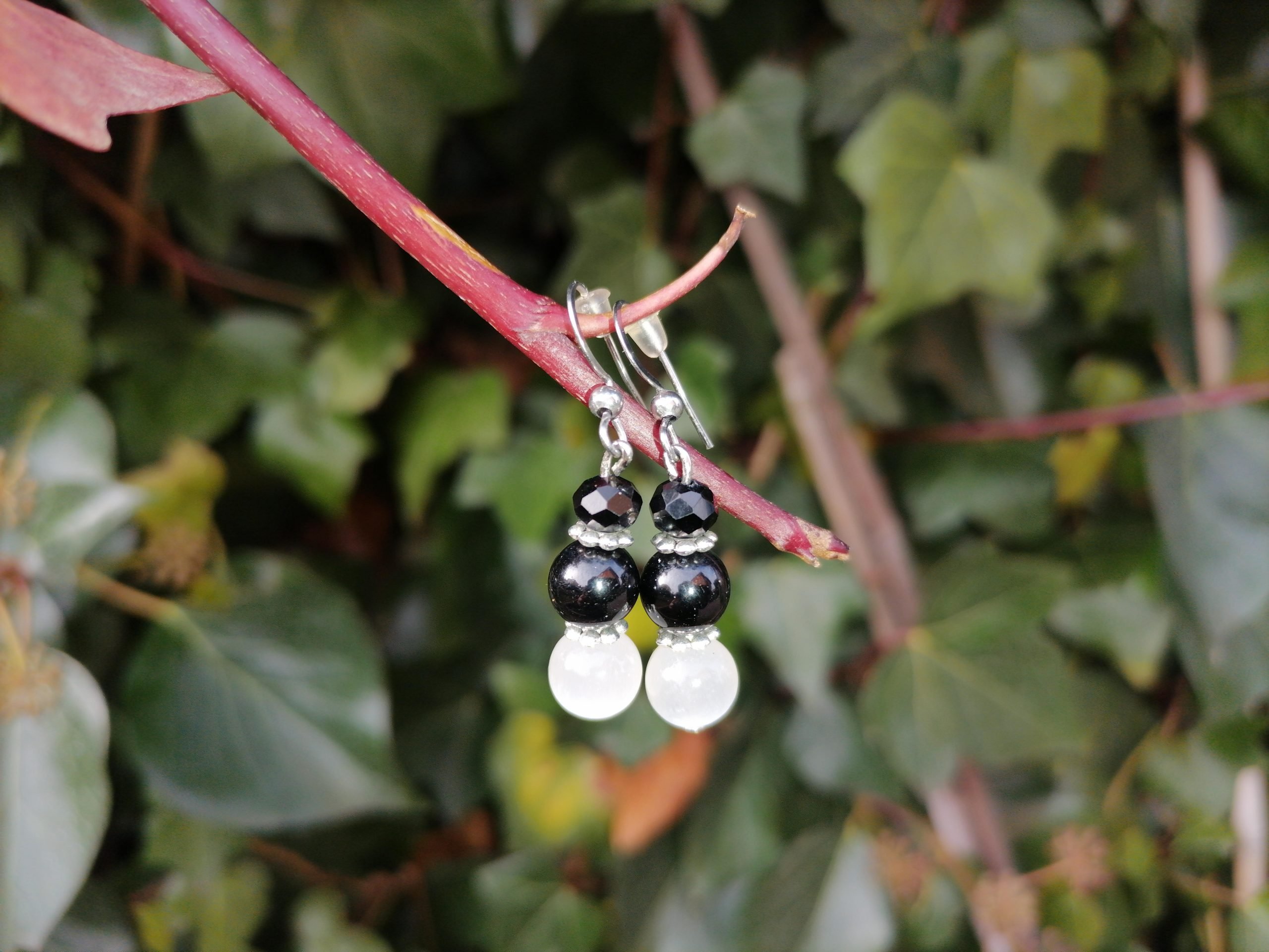 Pendientes de piedras naturales de Turmalina Negra y Selenita 8 mm. Separadores plateados. Perla de cristal negra faceteada.