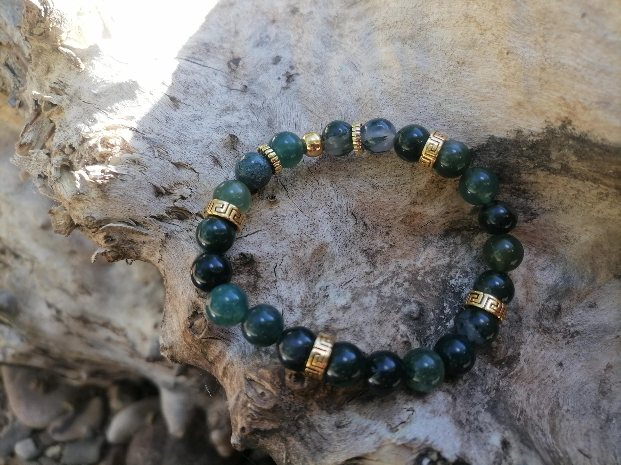 Pulsera de piedra natural de  Ágata de Musgo de 8 mm y separadores dorados.