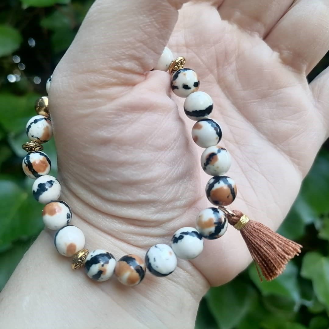 Piedra Natural 8mm. Pulsera elástica con separadores en dorados y borla tibetana marrón ocre.