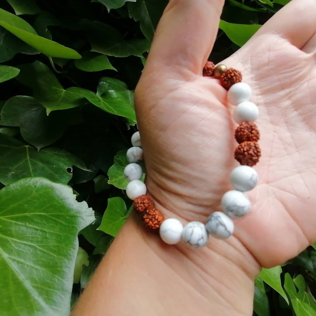 Pulsera mixta de piedras naturales de Howlita blanca y cuentas de Rudraksha de 8 mm.