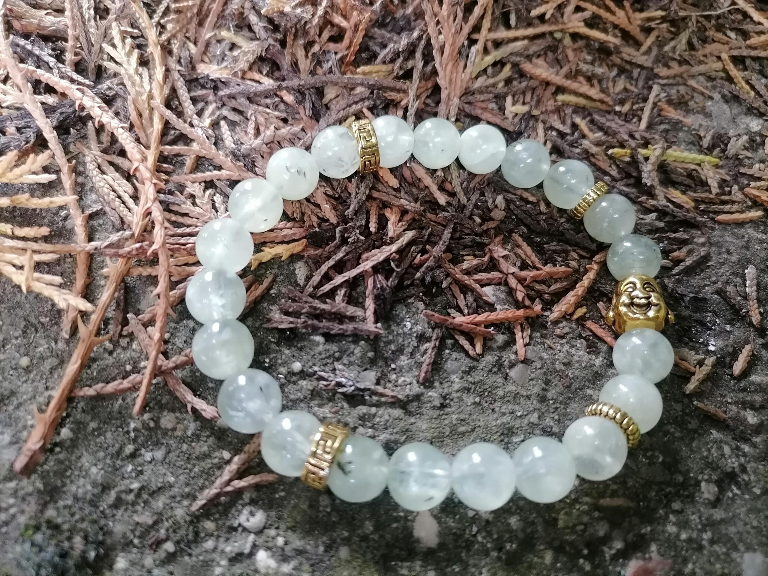 Pulsera de piedras semipreciosas de Prenhita de 8 mm con separadores dorados y Buda sonriente.