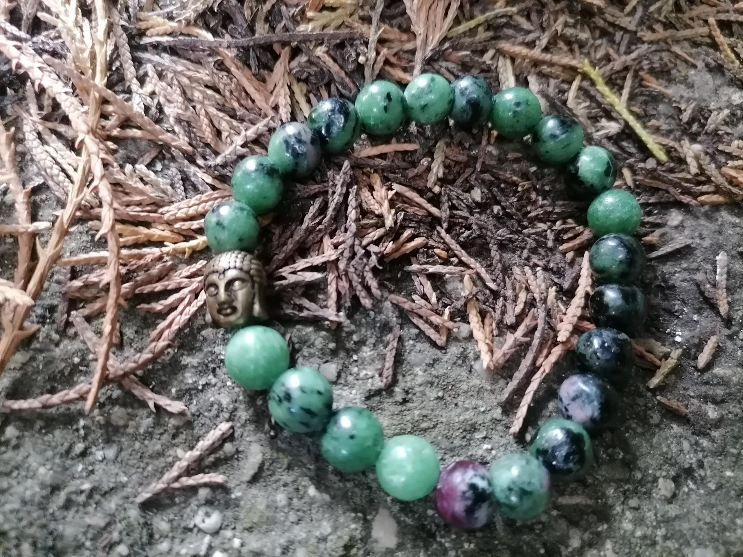 Pulsera de piedras semipreciosas de Zoisita Rubí de 8 mm con cabeza de buda en color bronce.