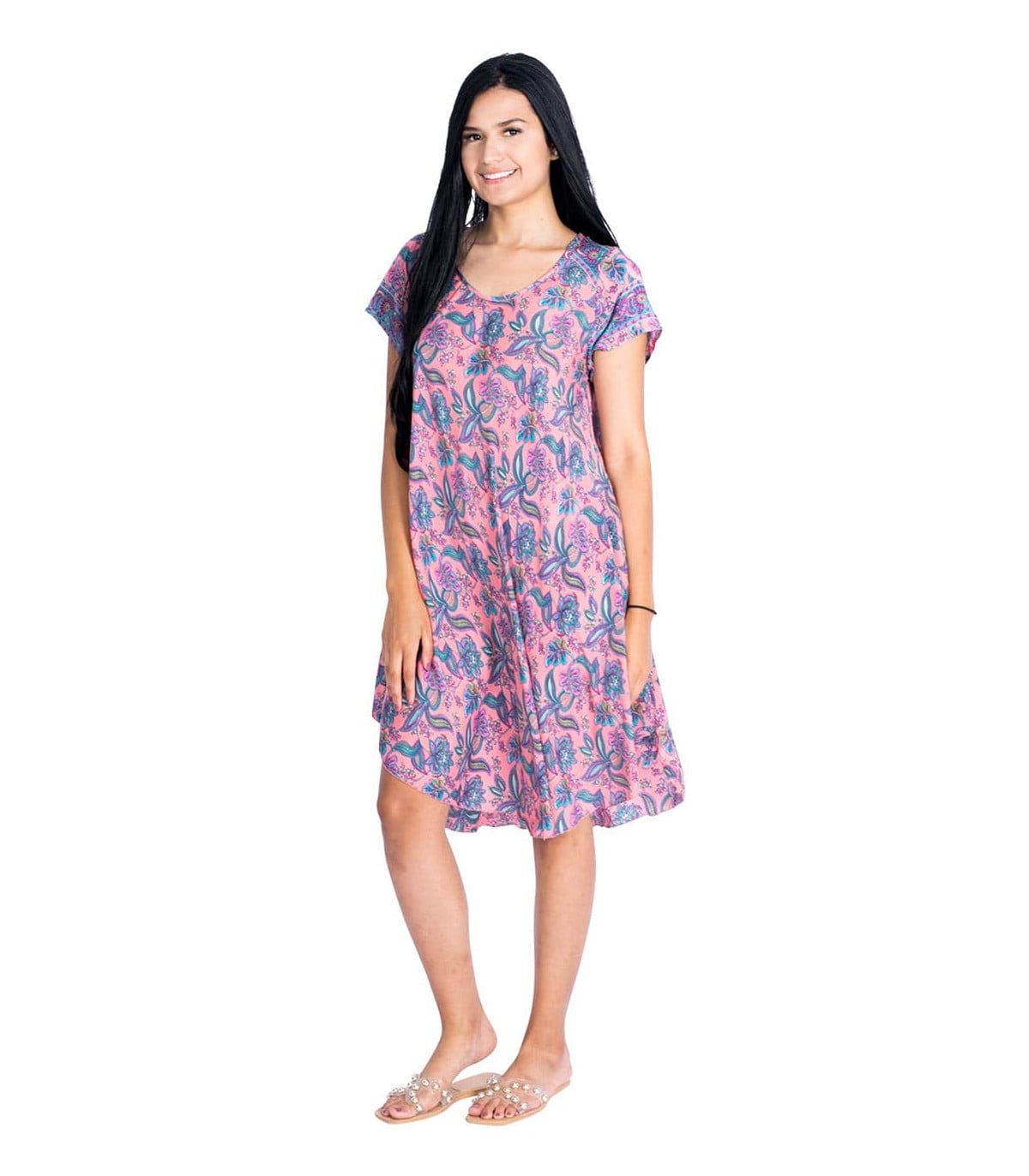 Vestido corto estampado con fondo rosa y dibujos en color turquesa
